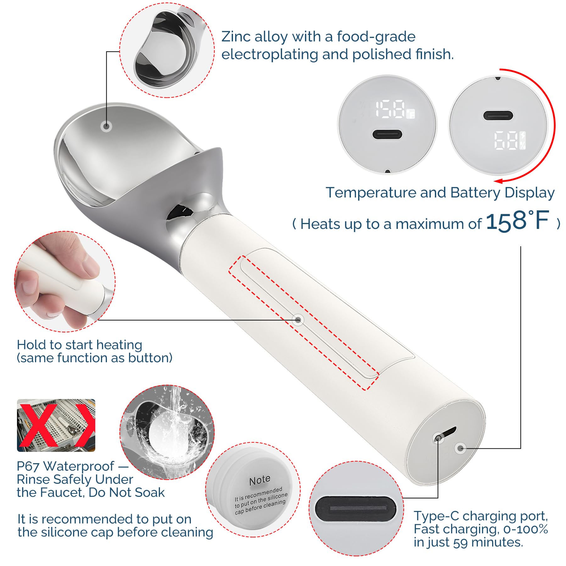 - USB RECHARGEABLE & WATERPROOF: Features a long-lasting USB rechargeable battery, so you can use it cordlessly anywhere – no cords or disposable batteries needed. A single charge powers dozens of scoops so it’s always ready for dessert time. Built with heavy-duty food-grade metal and an IP67 waterproof body for easy cleaning under running water (fully washable without damage). This durable, professional-quality heated scoop is built to last for countless scooping sessions